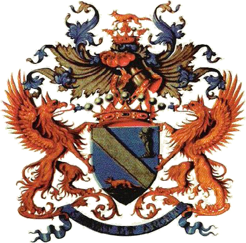 D’azur à la bande d’argent accosté en chef d’une jambe cuirassée et eperonnée du même, et en pointe d’un renard d’or passant sur une terasse de sinople.