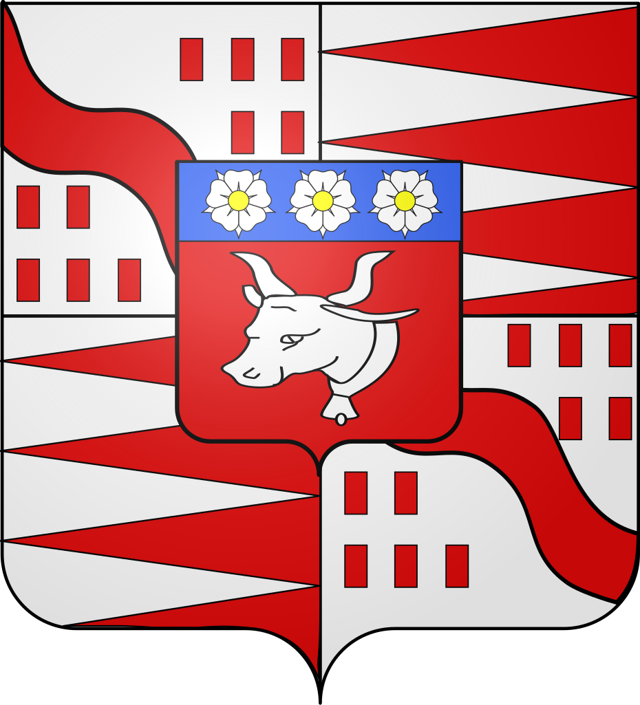 Note:d'argent à la bande ondée de gueules accostée de dix billettes du même, cinq en chef, posées 3 …