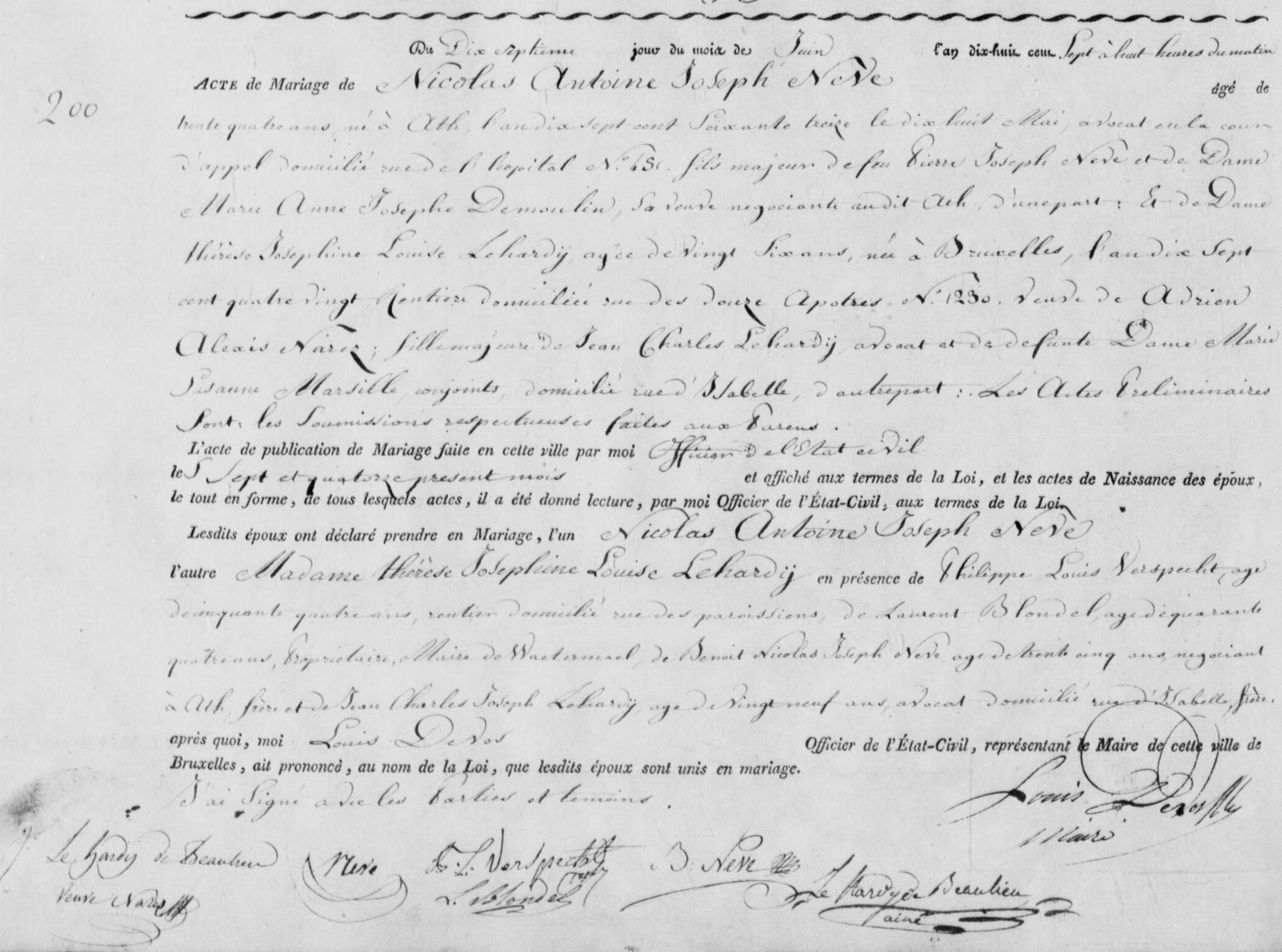 Acte de mariage de Nicolas Antoine Joseph Nève et Thérèse Joséphine Louise le Hardÿ de Beaulieu