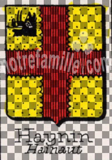 Haynin ou Hennin D'or, à la croix engrêlée de gueules, acc. au premier canton d'un croissant du même. Variante des armes des Hayzzin en Hainaut qui portent seulement: la croix, ou celle-ci acc. au 1, une hure de sanglier de sable défendue d'argent. Les H. de la Vallée en Brabant, remplacent le croissant par une étoile, enfin Henri d'H., prêtre, figure dans l'armorial de 1696 Flandres, porte: d'or à la croix engrêlée de gueules, à la bordure engrêlée de même.