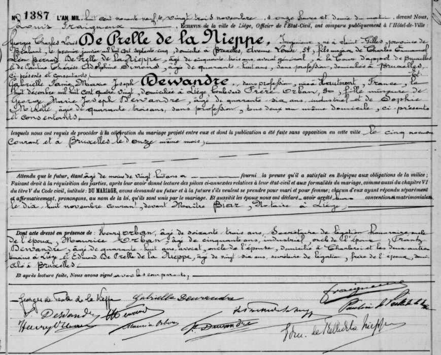 Ce jeudi 23 (novembre 1899), dans l'église St-Jacques, le mariage de Mlle Gabrielle-Louise-Marie-Joseph Dewandre, fille de M. et Mme Georges Dewandre-Minette, avec M. Georges-Charles-Louis de Prelle de la Nieppe, ingénieur, fils de Charles-Emmanuel-Léon, avocat-général à la Cour de cassation à Bruxelles, et de Mme née Adolphine-Thérèse Simons. | | Dernière modification | 8 juillet 2015 – 17:49:13