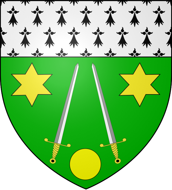 de sinople à deux épées d'argent, garnies d'or, posées en chevron, accompagnées en chef de deux étoiles à six rais et en pointe d'un besant, le tout d'or ; au chef d'hermine.