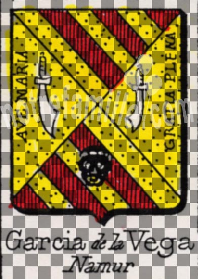 Note :écartelé en sautoir en chef et en pointe barré d'or et de gueules de six pièces, chargé sur le quartier inférieur d'une tête de More tortillée d'argent, aux flancs: d'or au cimeterre d'argent, acc. au quartier dextre des mots: AVE MARIA, et au quartier senestre des mots: GRATIA PLENA, en lettres capitales d'azur mises en orle. Couronne de comte. Supports: deux lions contournés au naturel.