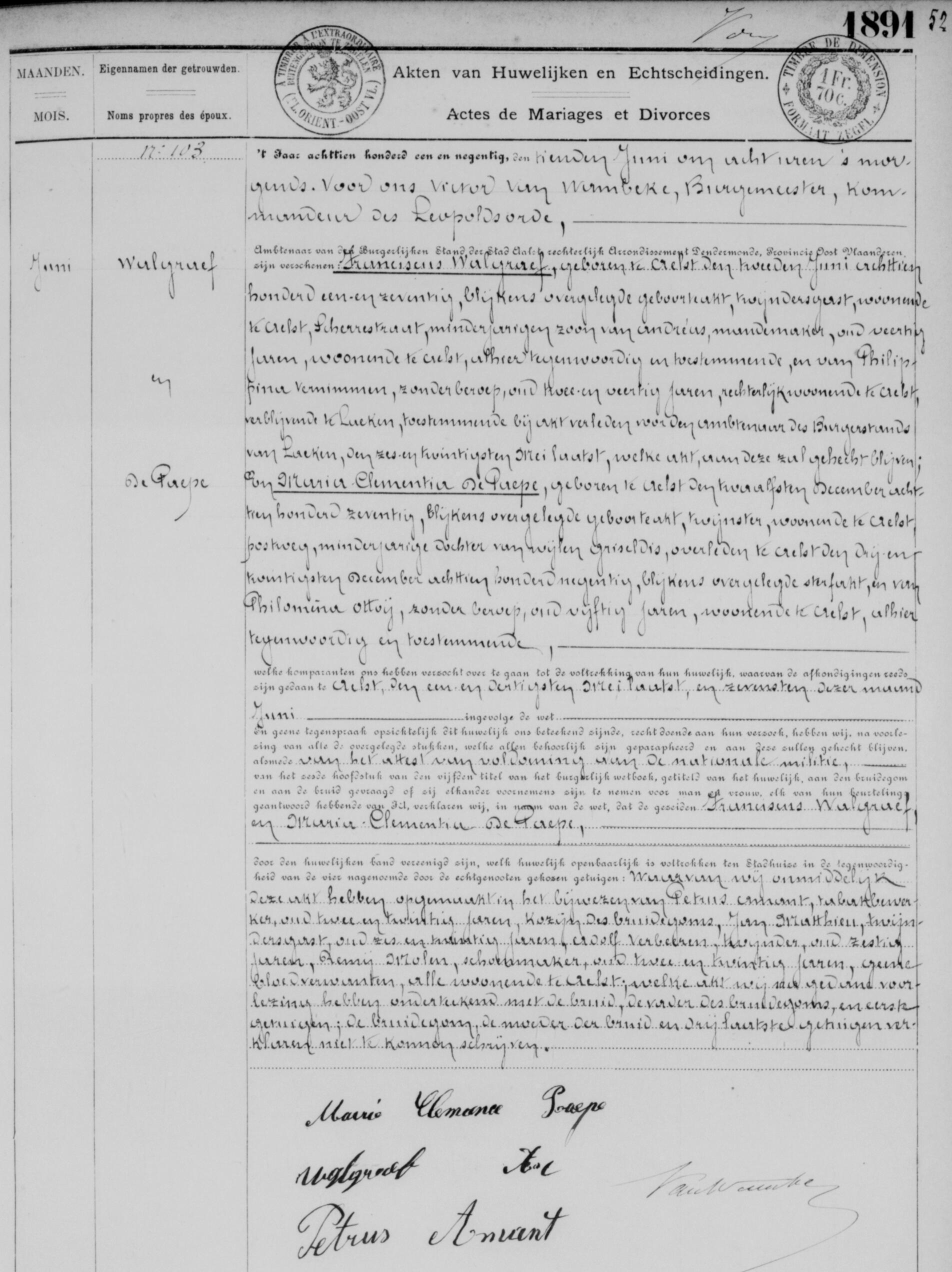 Acte de mariage de François Walgraef avec Marie Clémentine De Paepe
