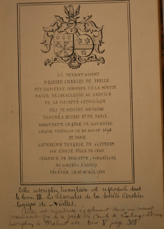 Pierre tombale des époux Prelle - Coppehem (avant le transfert de l'Eglise Saint-Jacques au cimetière de Nivelles).