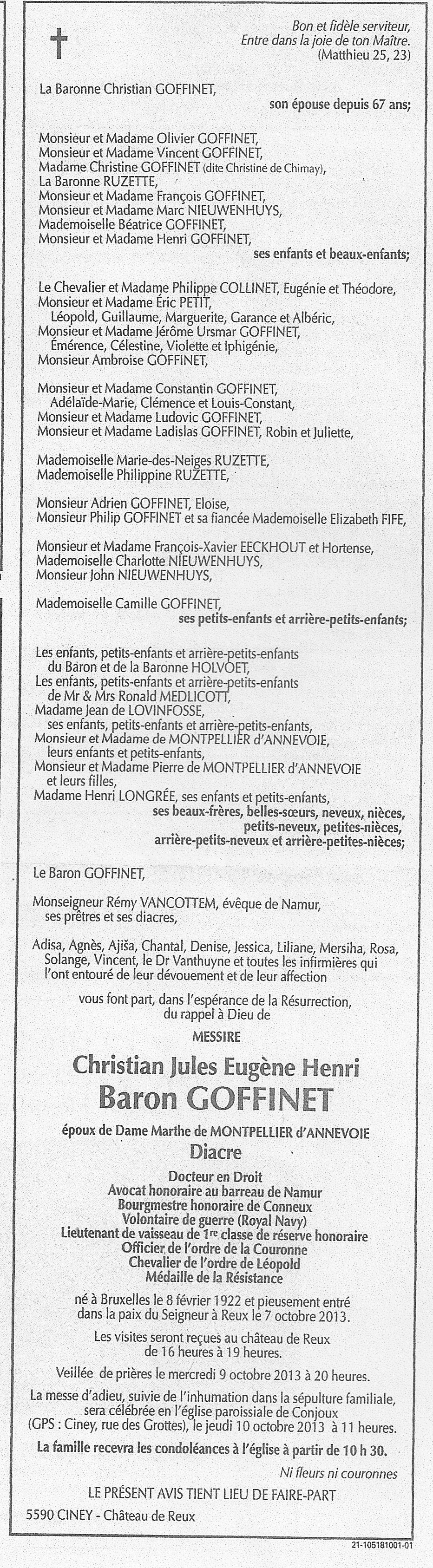 Faire-part de décès de Messire Christian Jules Engène Henri Baron GOFFINET