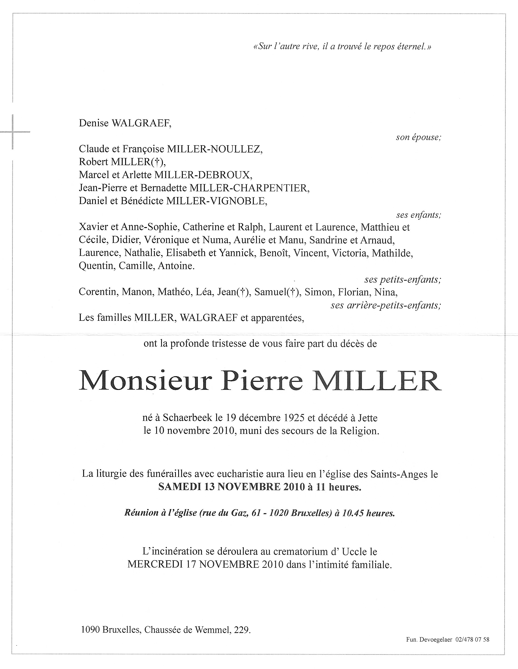| Pierre Aloÿs Miller | 19 décembre 1925 | 99 | Schaerbeek, Bruxelles, Brabant, Belgique | 5 | 10 novembre 2010 | 15 | 84 | Jette, Bruxelles, Belgique | 21 juin 2025 - 19:09:18 | M | YES | Y100 | ||||