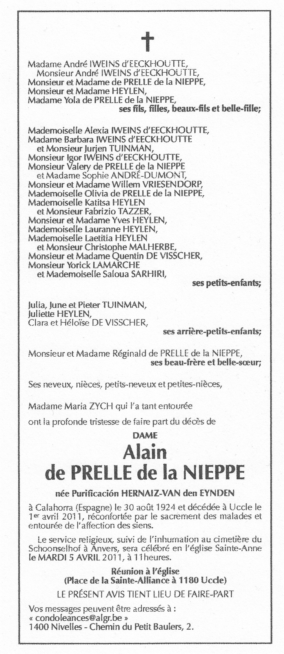 Faire-part de décès de dame Alain de Prelle de la Nieppe (née Purificación Hernaiz-Van den Eyden