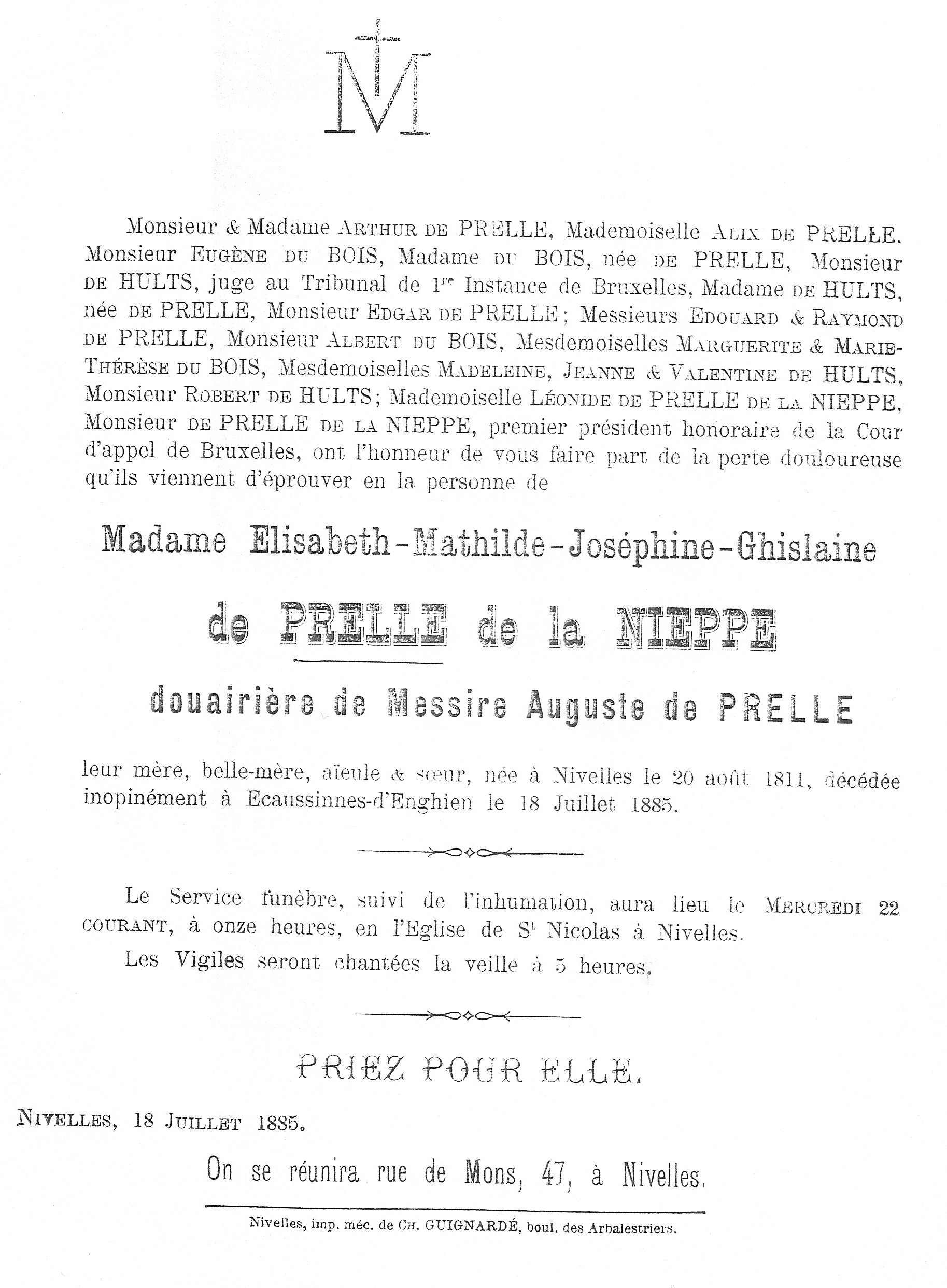 Faire-part de décès d'Elisabeth-Mathilde-Joséphine-Ghislaine de PRELLE de la NIEPPE (1811-1885), douairière de Messire Auguste de PRELLE