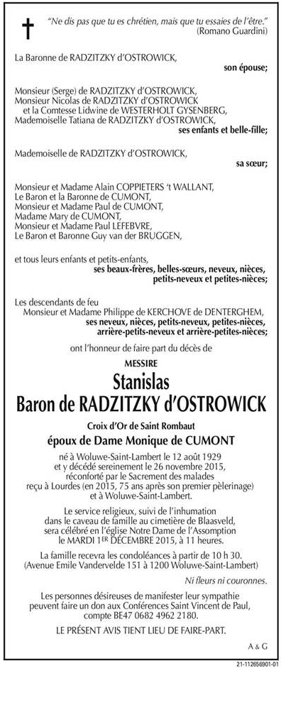 Faire-part de décès de Messire Stanislas Baron de Radzitzky d'Ostrowick (1929-2015)