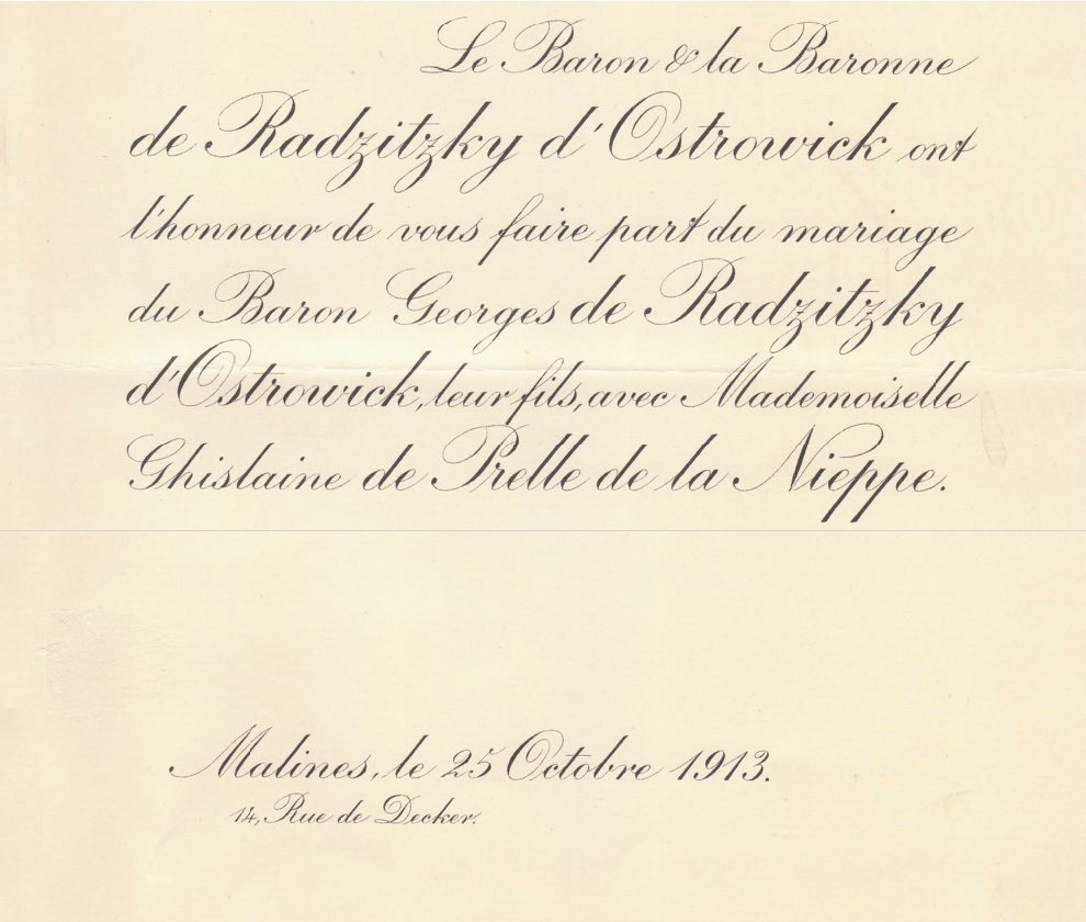 Faire part du mariage de Mademoiselle Ghislaine de Prelle de la Nieppe avec le Baron Georges de Radzitzky d'Ostrowick