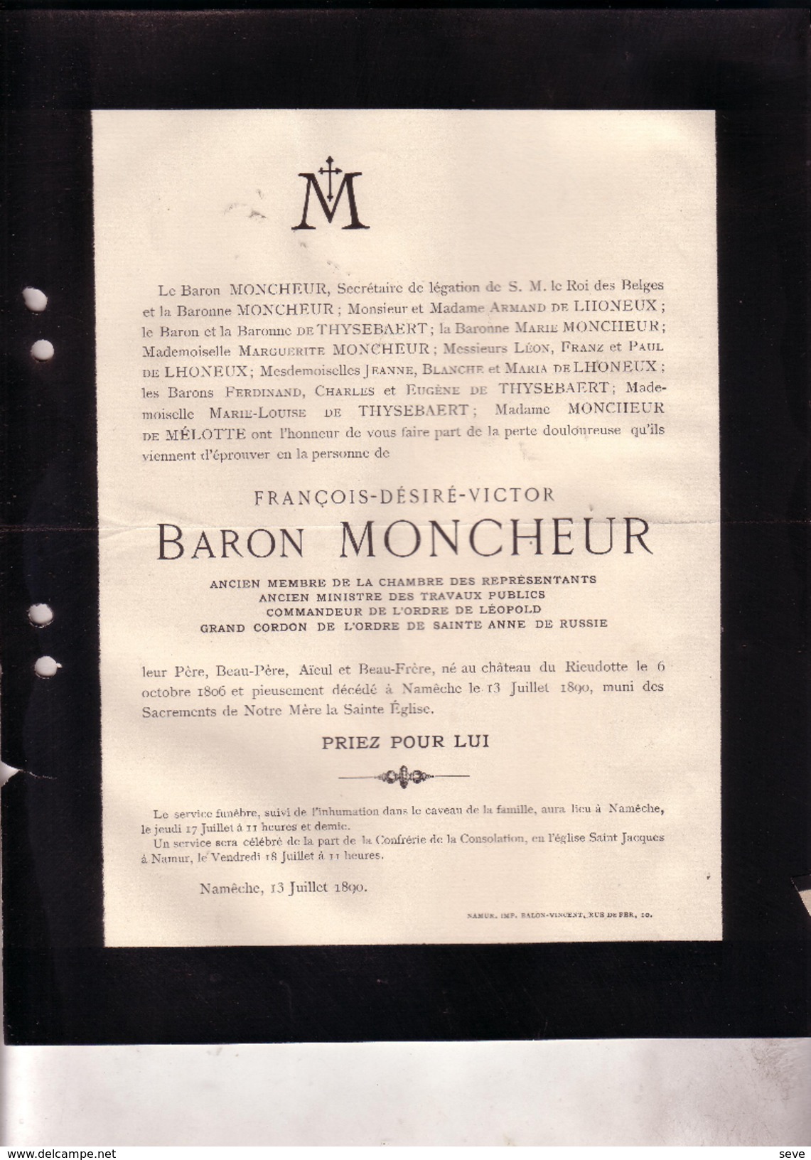 Faire-part de décès de François Désiré Victor, Baron Moncheur