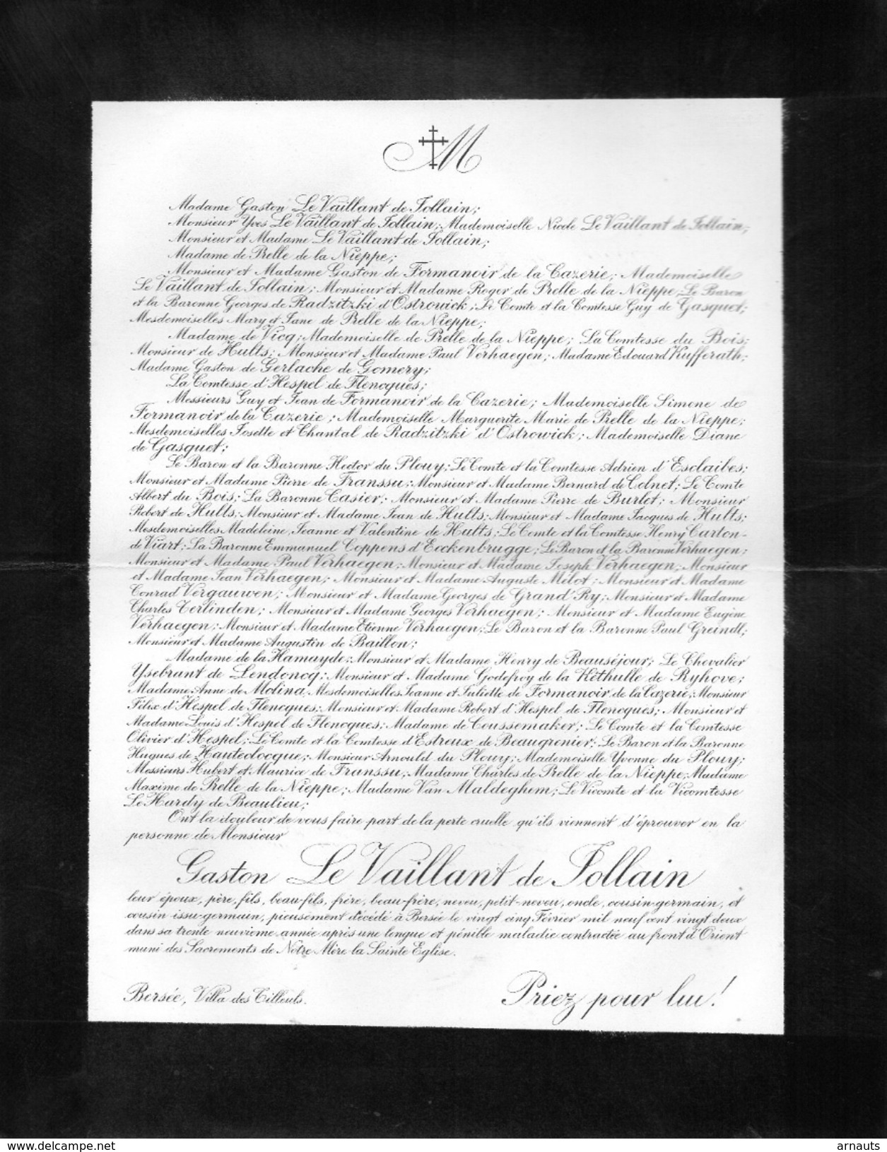 Faire-part de décès de Gaston le Vaillant de Jollain