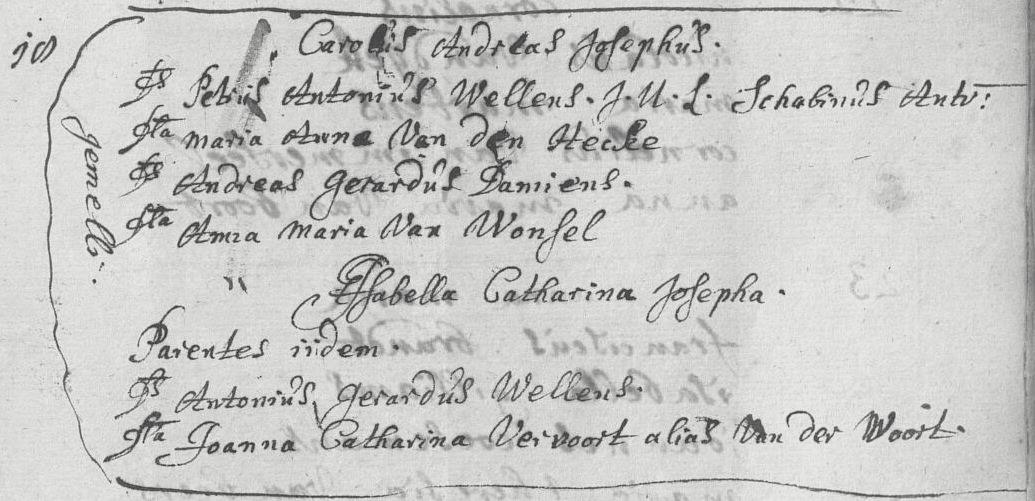 Acte de baptême de Charles André Joseph Wellens (et de sa sœur jumelle Isabelle Catherine Josèphe)