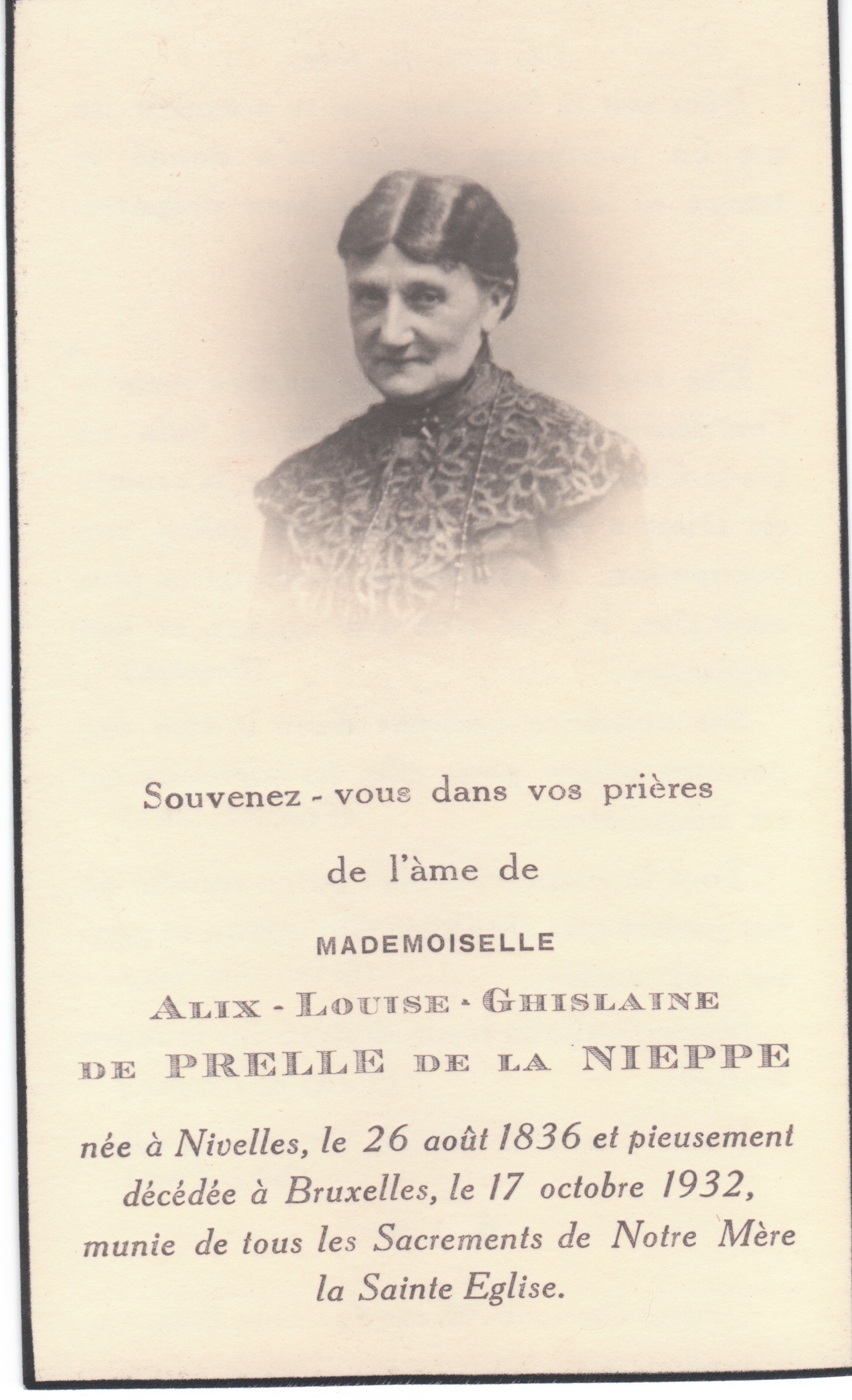 | Alix Louise Ghislaine de Prelle de la Nieppe | 26 août 1836 | 189 | Nivelles, Brabant, Belgique | 0 | 17 octobre 1932 | 93 | 96 | Bruxelles, Brabant, Belgique | 19 novembre 2025 - 07:50:31 | F | YES | Y100 | ||||