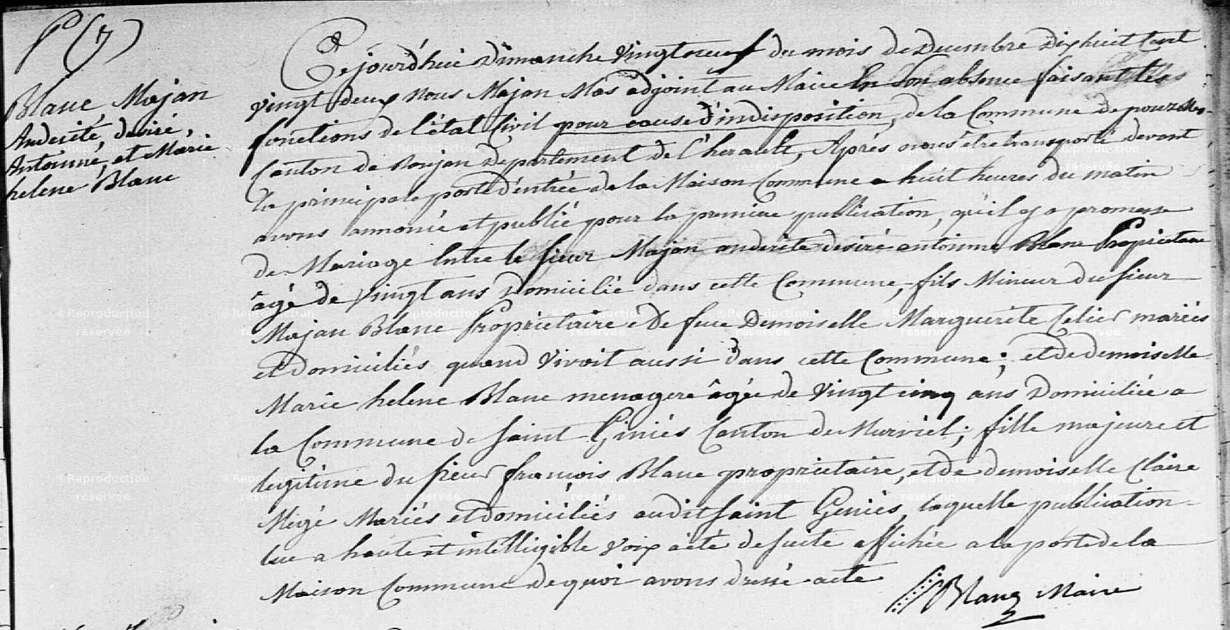 Publication de mariage de Majan Blanc avec Marie Hélène Blanc (Pouzolles)
