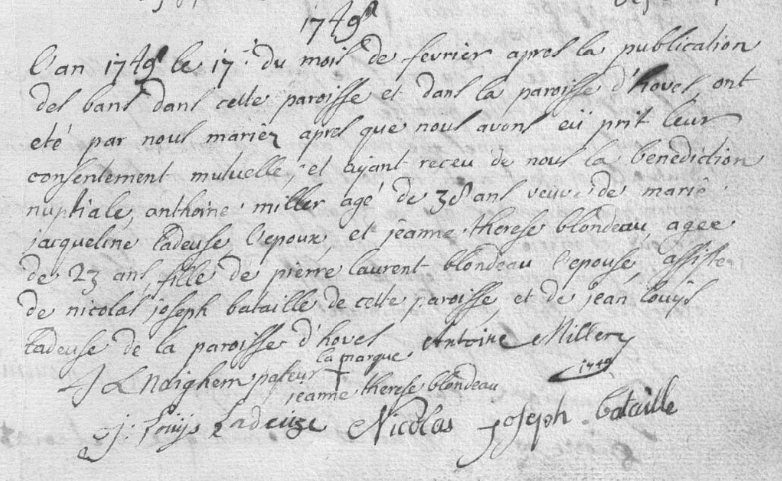 Acte de mariage d'Antoine Miller avec Jeanne Thérèse Blondeau