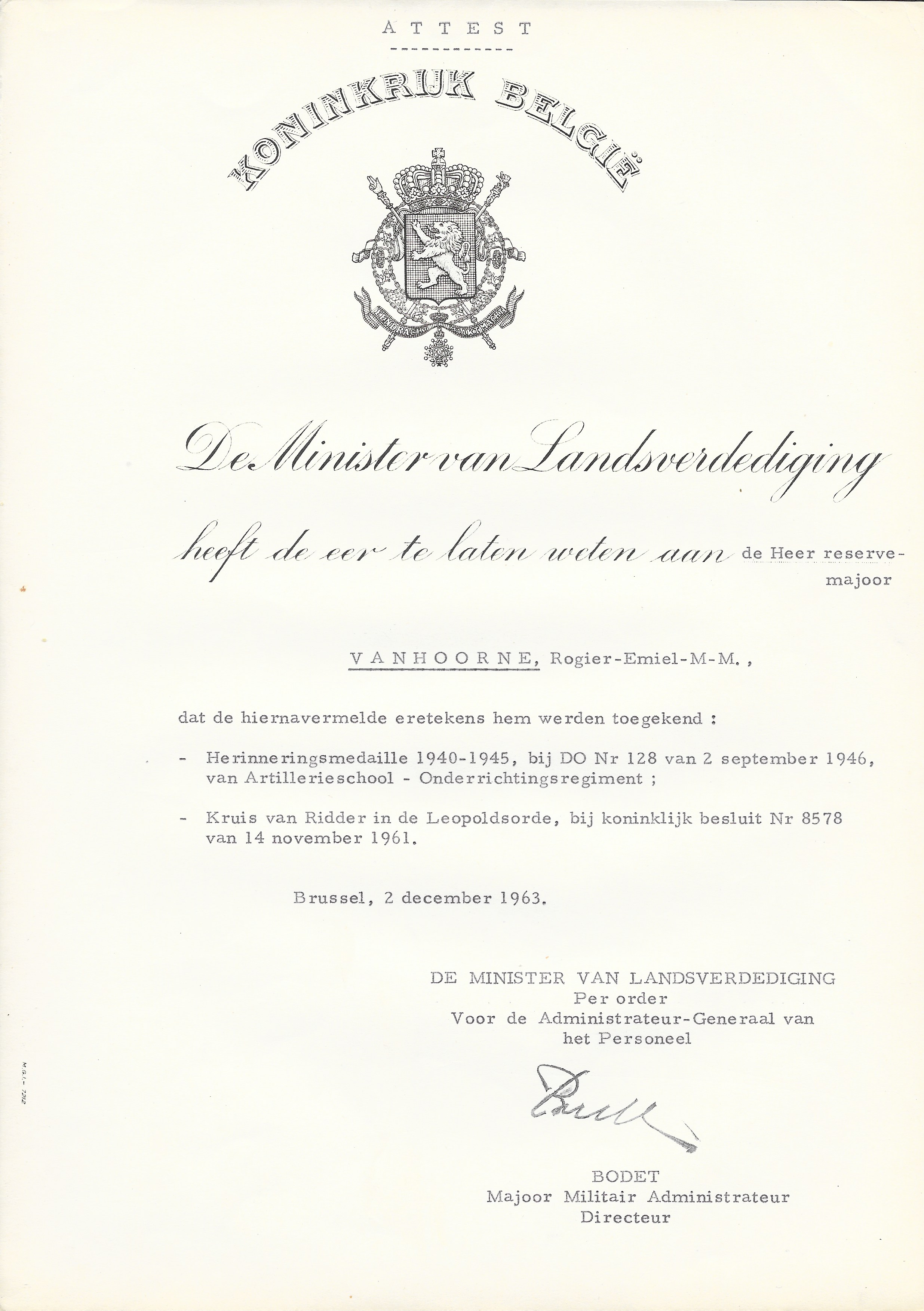 Rogier Vanhoorne, major de réserve, médaille du souvenir de la guerre 40-45 (DO Nr 128 du 2 septembre 1946)