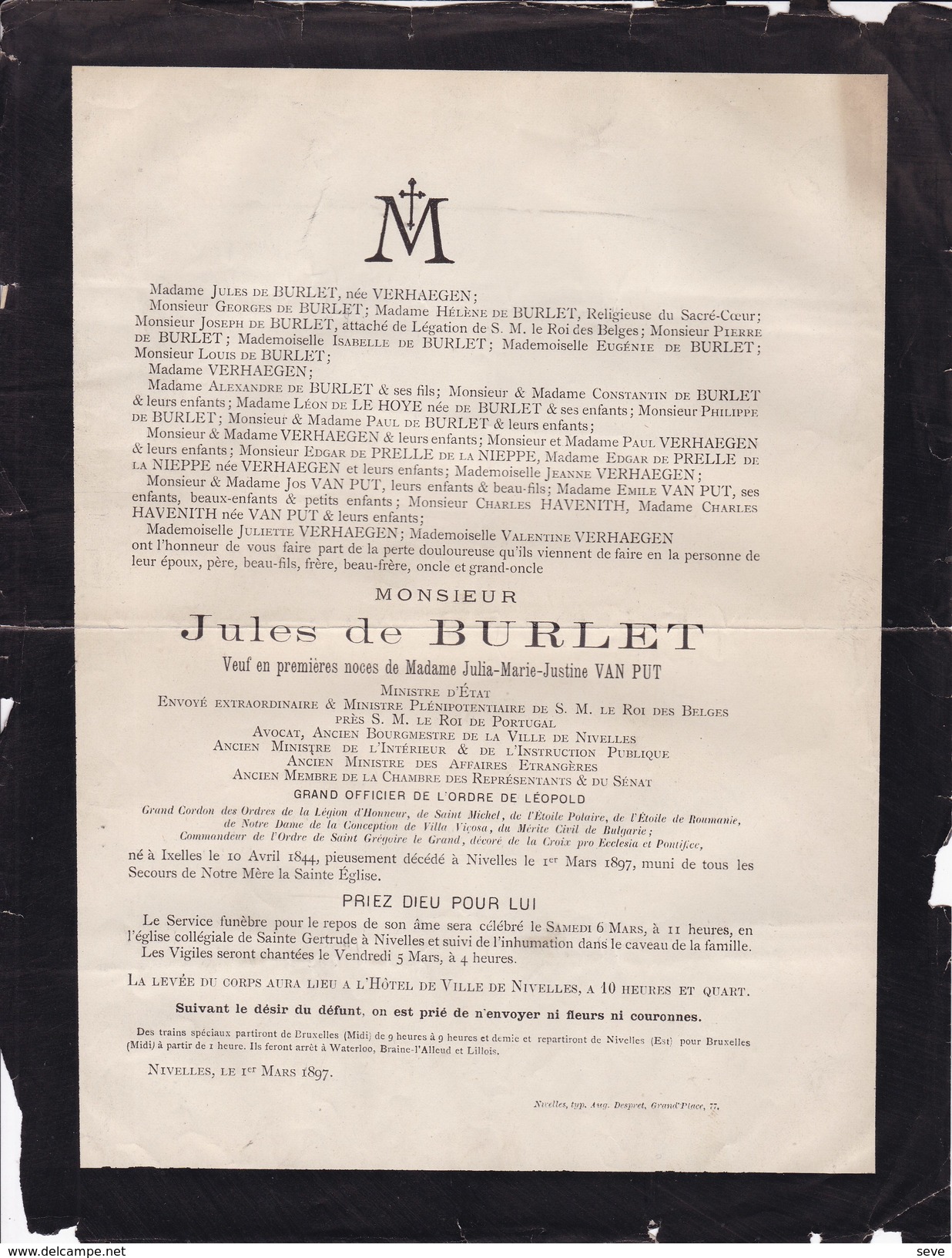 Faire-part de décès de Jules de Burlet