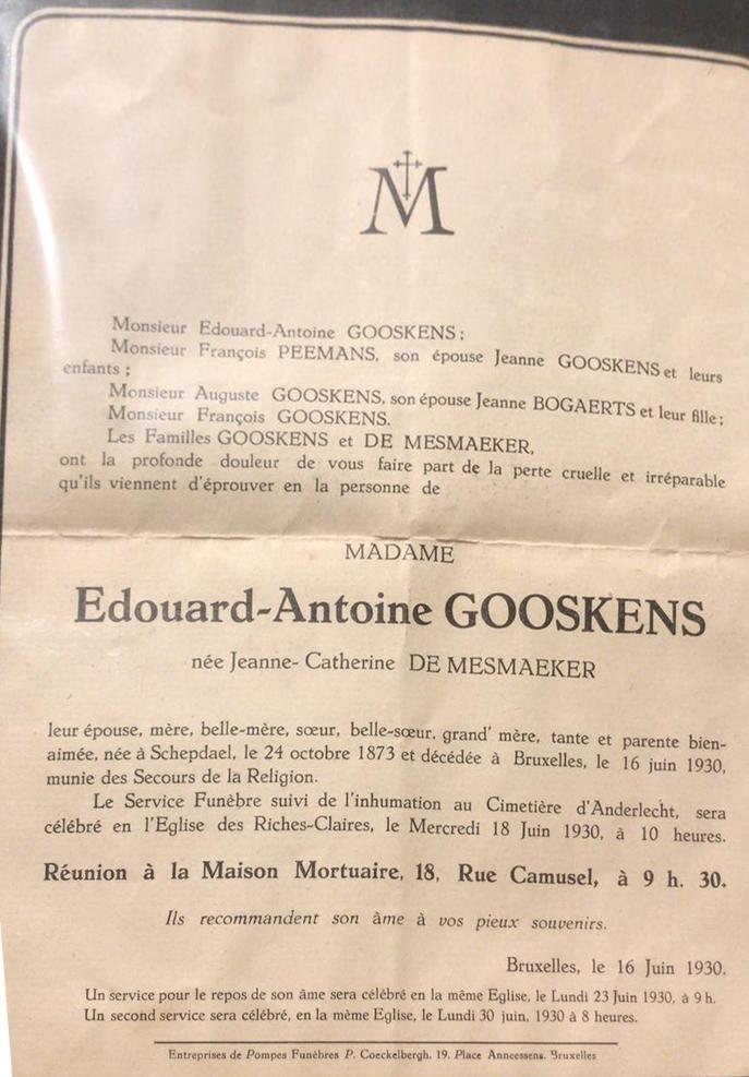 Faire-part de décès de Jeanne Catherine De Mesmaeker