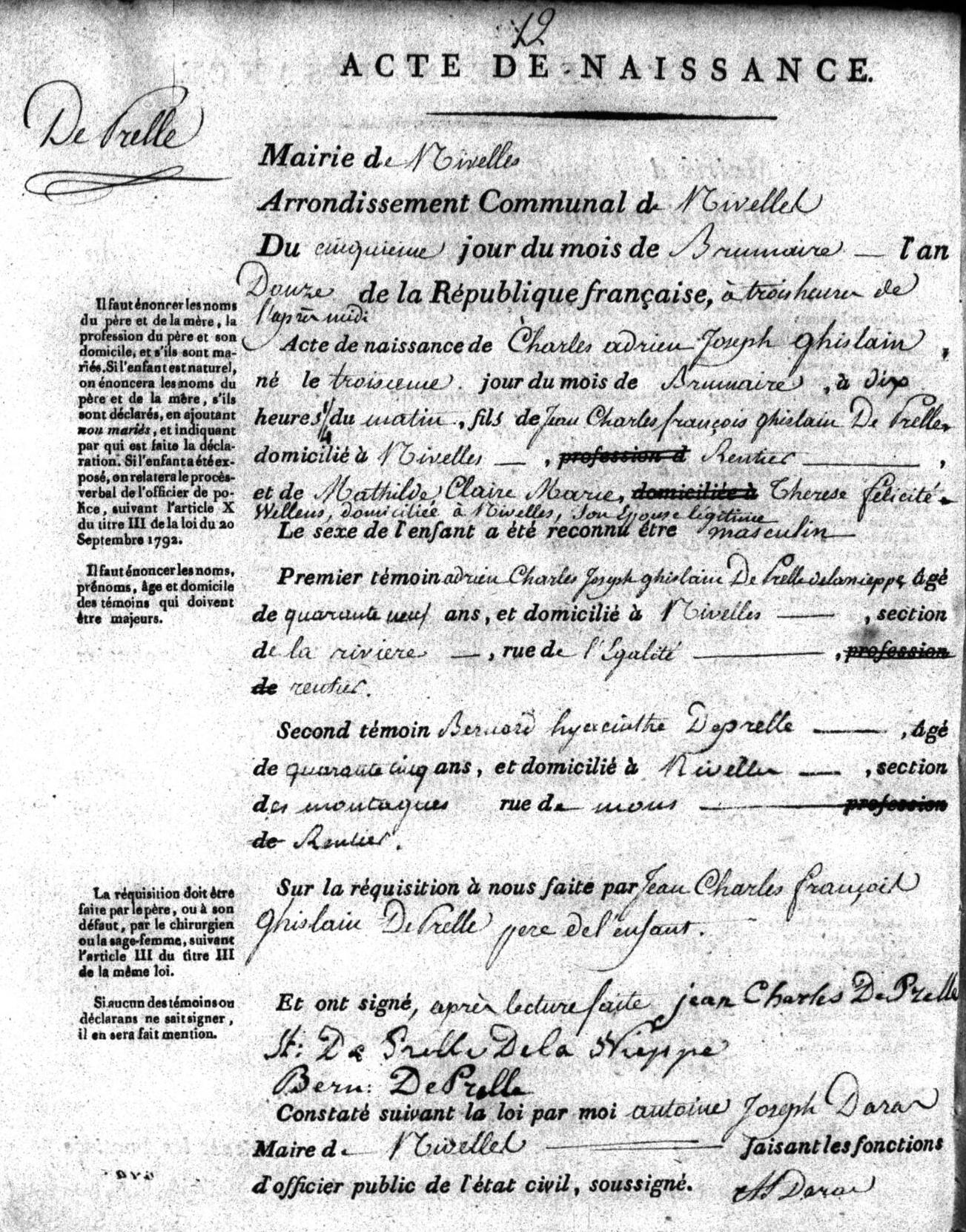 Acte de naissance de Charles Adrien Joseph Ghislain de Prelle ° 1803