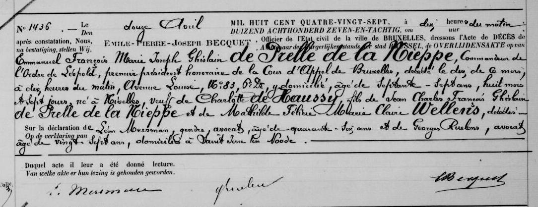 Acte de décès d'Emmanuel François Marie Joseph Ghislain de Prelle de la Nieppe ° 1887