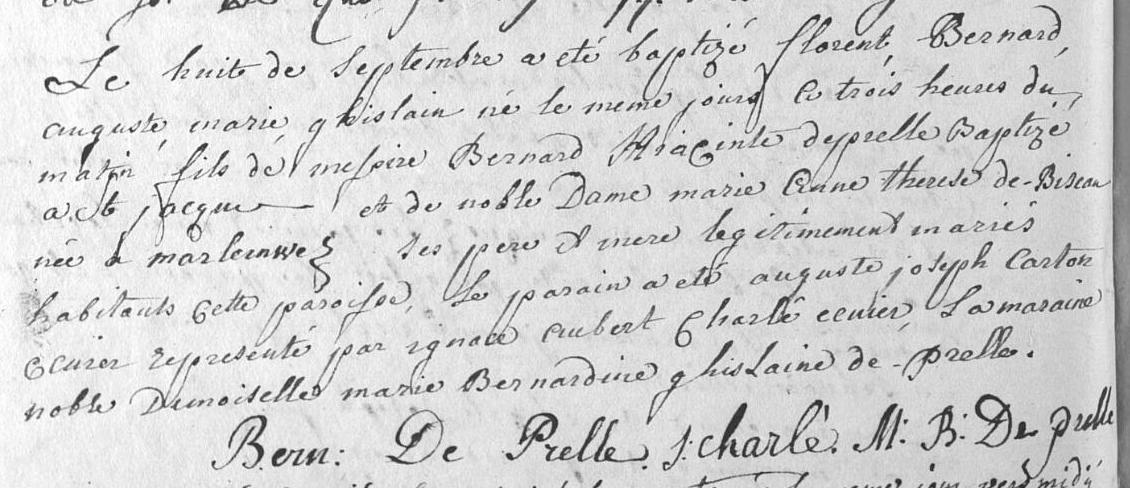 Acte de Baptême de Florent Bernard Marie Ghislain de Prelle ° 1791
