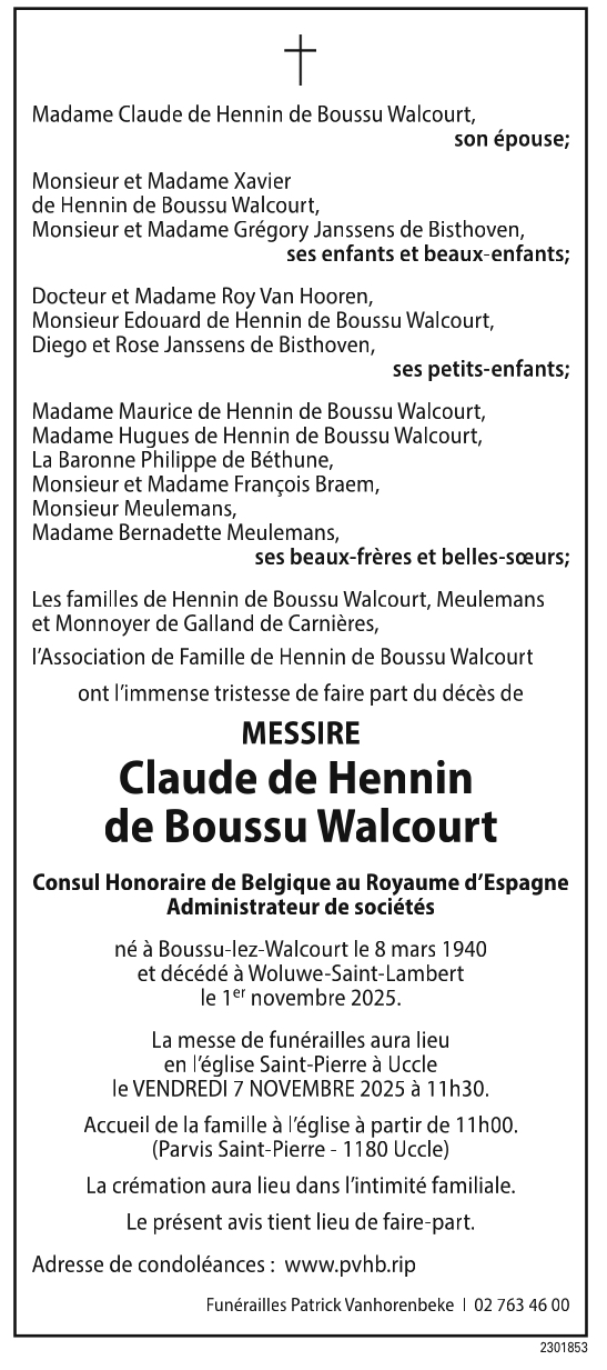 | Claude Odet Jean Marie Joseph Ghislain de Hennin de Boussu Walcourt | March 8, 1940 | 85 | Boussu-lez-Walcourt, Hainaut, Belgique | 2 | November 1, 2025 | 0 | 85 | Woluwe-Saint-Lambert, Bruxelles, Belgique | November 8, 2025 - 3:29:49 p.m. | M | Y100 | Y100 | ||||