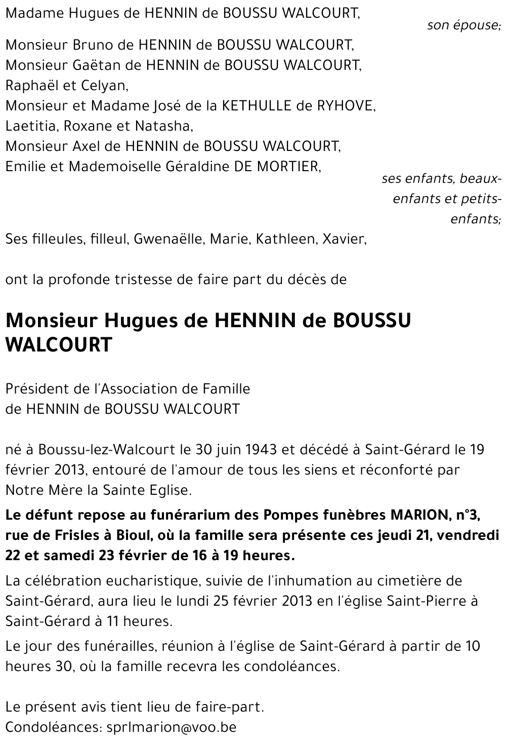 Faire-part de décès de Hugues de Hennin de Boussu Walcourt