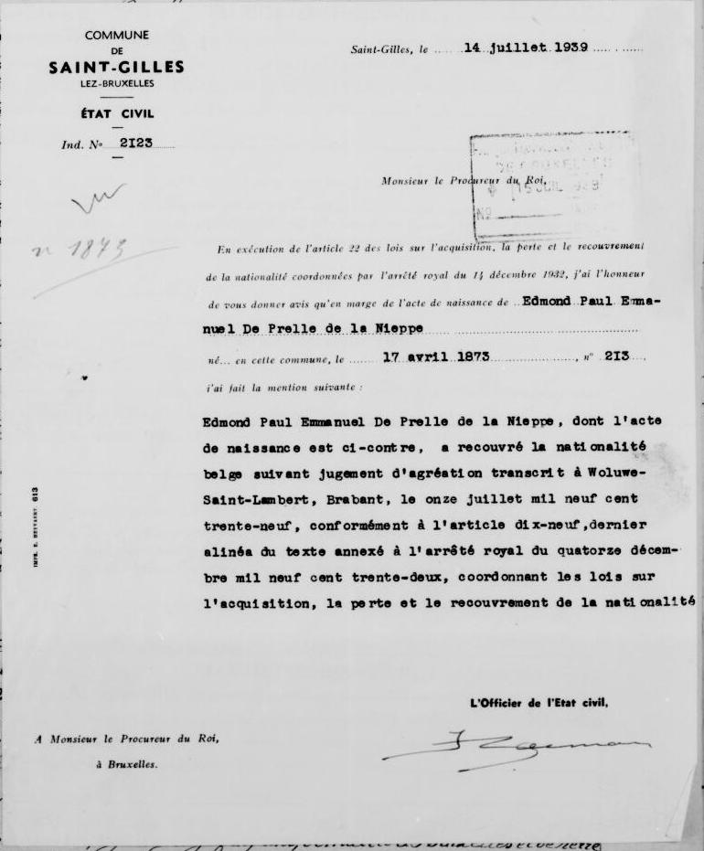 Recouvrement de la nationalité belge d'Edmond de Prelle de la Nieppe en 1939