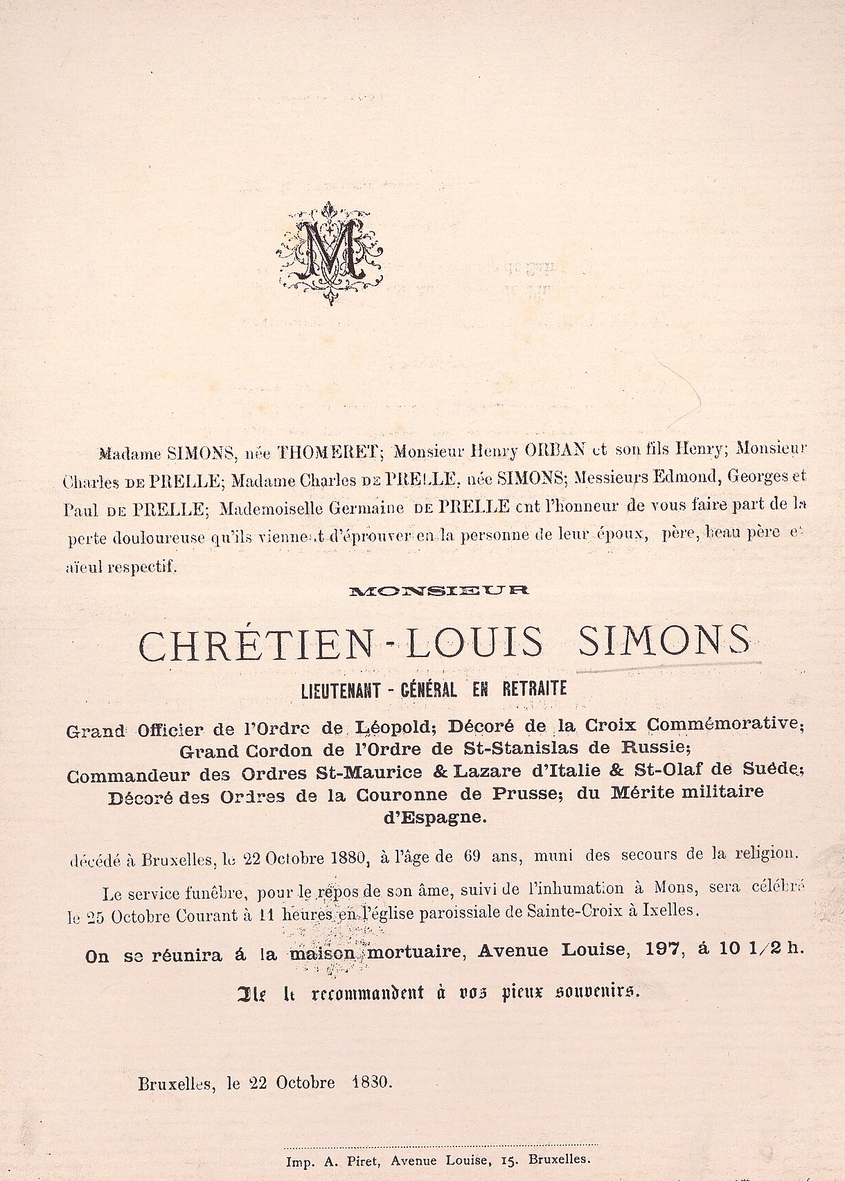 Faire-part de décès de Chrétien-Louis Simons † 1880