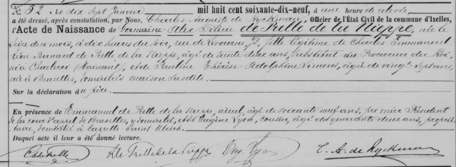 Acte de naissance de Germaine de Prelle de la Nieppe ° 1879
