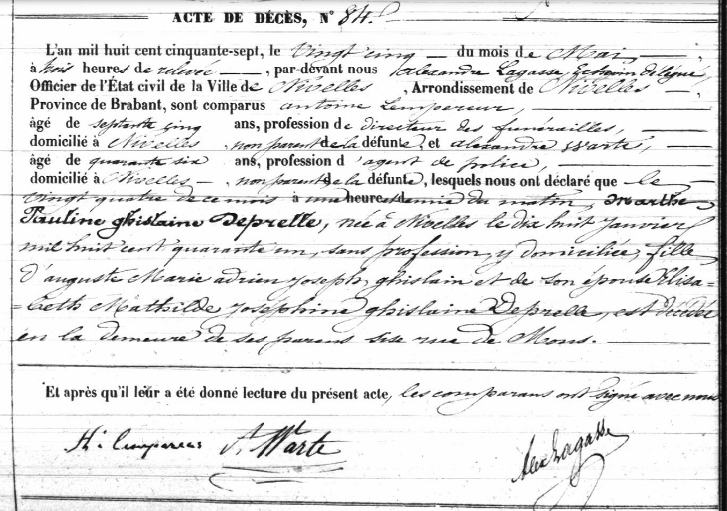| Marthe Pauline Ghislaine de Prelle de la Nieppe | January 18, 1841 | 184 | Nivelles, Brabant, Belgique | 0 | May 24, 1857 | 168 | 16 | Nivelles, Brabant, Belgique | November 19, 2025 - 8:59:14 p.m. | F | YES | YES | ||||