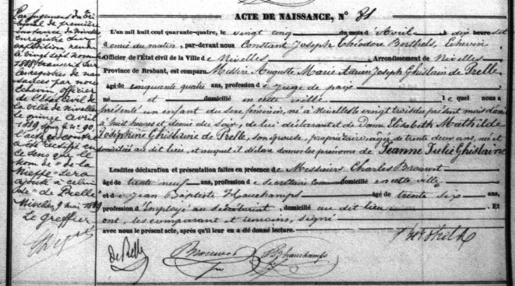 Acte de naissance de Jeanne de Prelle de la Nieppe ° 1844