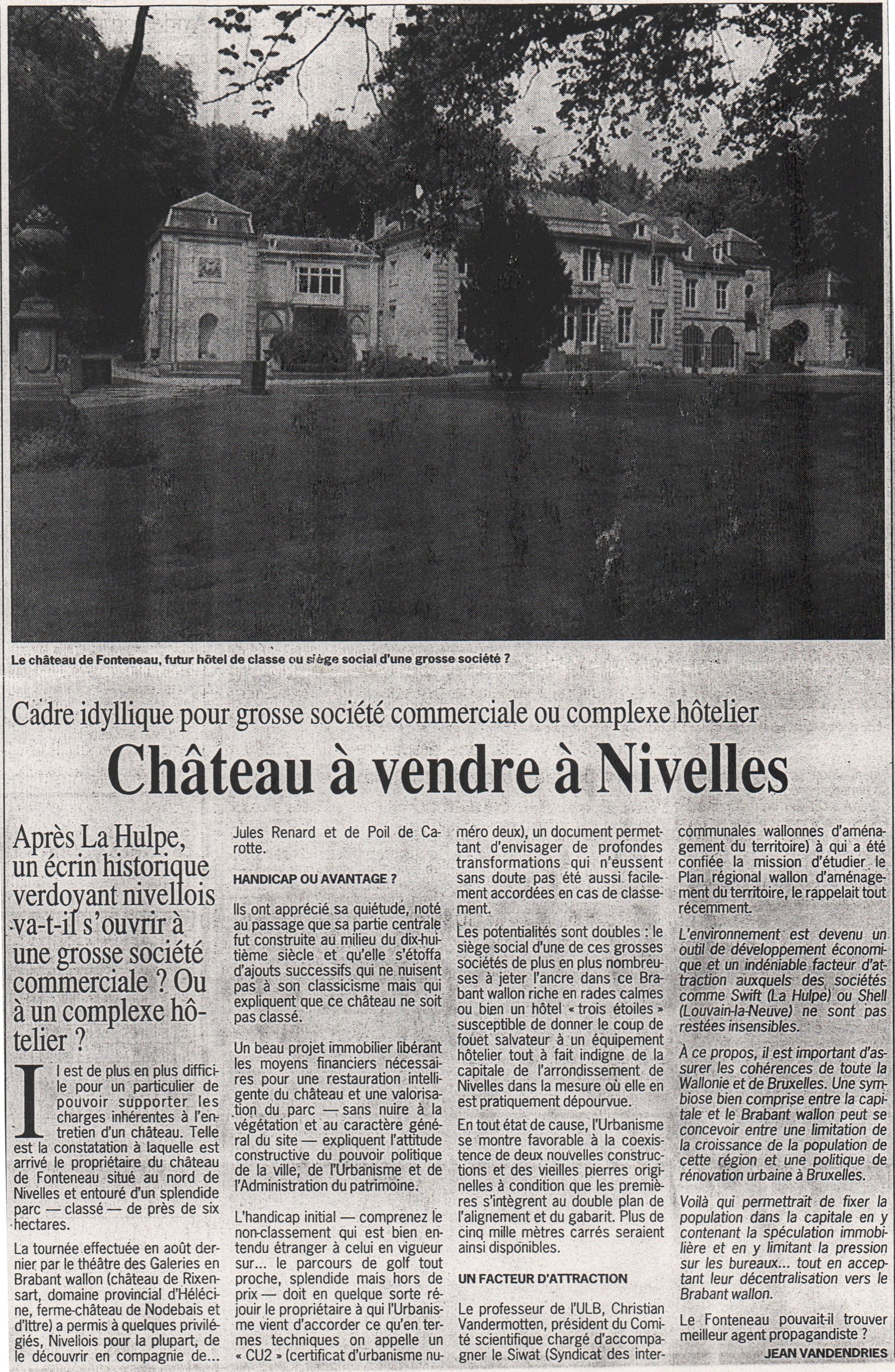 ”Château à vendre à Nivelles Après la Hulpe, un écrin historique verdoyant Nivellois va-t-il s'ouvrir à une grosse société commerciale ? Ou à un complexe hôtelier ? Il est de plus en plus difficile pour un particulier de pouvoir supporter les charges inhérentes à l'entretien d'un château. Telle est la constatation à laquelle est arrivé le propriétaire du château de Fonteneau situé au nord de Nivelles et entouré d'un splendide parc - classé - de près de six hectares (...)” Source: Journal Le Soir, Ven 6 décembre 1991, Jean Vandendries