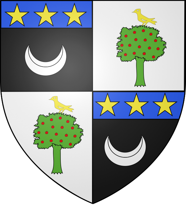 écartelé, aux 1 et 4 de sable, au croissant d’argent, au chef d’azur, chargé de trois étoiles d’or ; aux 2 et 3 d’argent, au pommier de sinople, sur lequel est perché un cocu (oiseau) d’or. Source (blasonnement): Grand armorial international www.grand-armorial.net Modélisé par Arnaud de Prelle à partir d'éléments de wikimedia 20111125